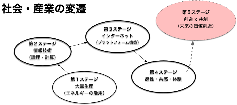 - 第5ステージ 社会の分断を放っておけば、差別や排除、戦争などという愚かな行為の後押しに繋がってしまいます。心ある人たちは、「創造X感性X共創」という発想で、新たな産業や社会を提案しています。多様な価値観を認める。その前提として、一人一人が尊重されることが当たり前となる。一人一人の持ち味を活かすために協力し合う段階。
